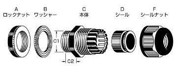 ●材質:ロックナット・本体・シールナット/66ナイロン(UL94V-2)・ワッシャー・シール/EPDM